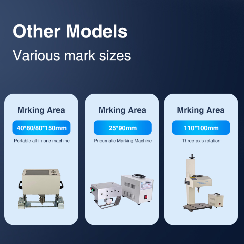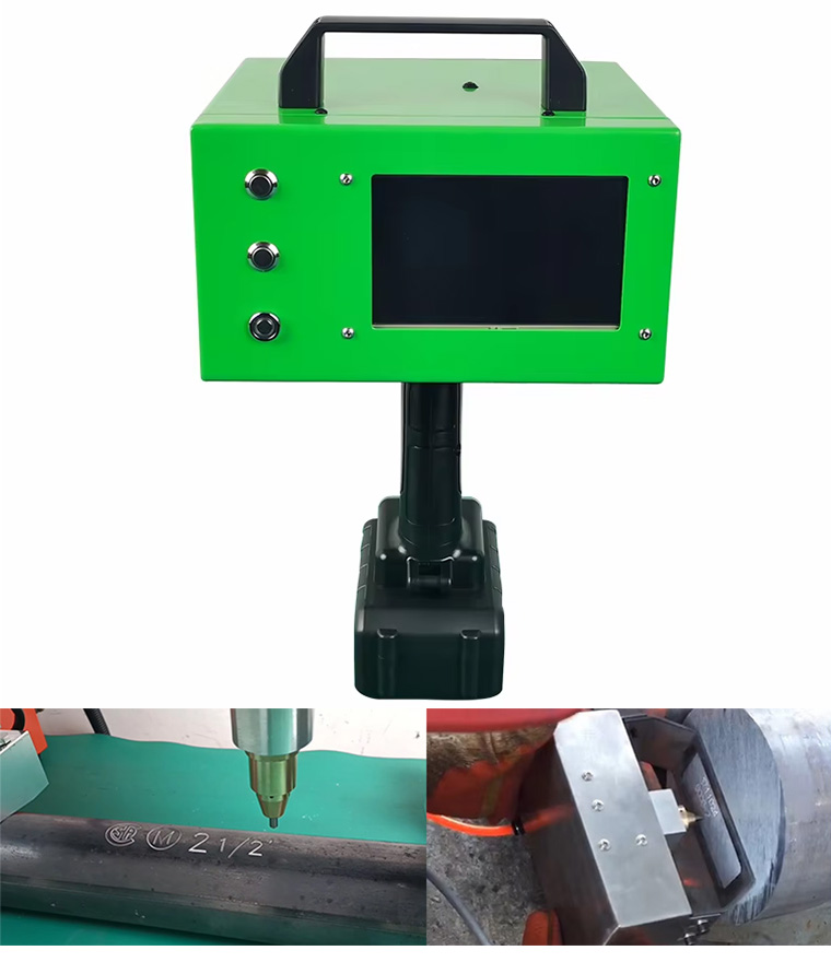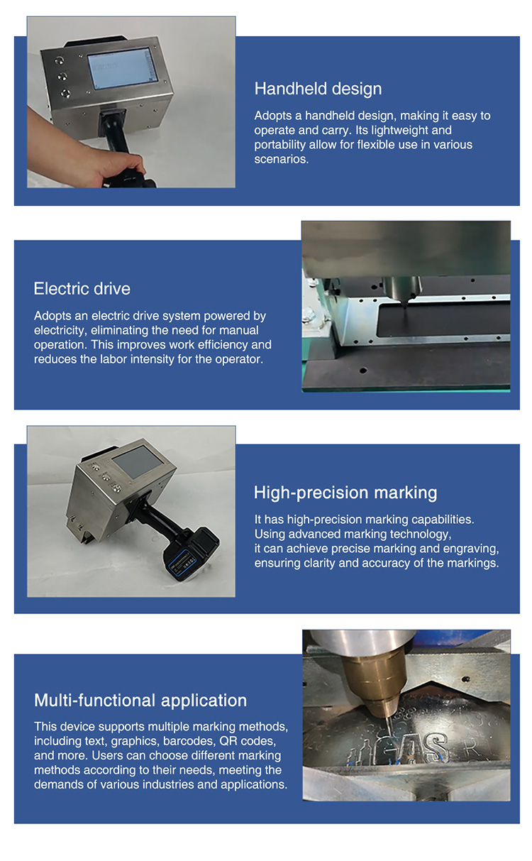 Handheld electric marking machine powered by lithium battery,with long standby time and no cable constraints. Lightweightdesign, efficient driving, suitable for multi-angle marking, strongportability. The dot matrix marking needle assembly adoptshigh hardness alloy needle and electromagnetic coil, with noneed for pneumatic tube connection. Provides a large markingrange and larger font size, reducing operational burden.Low overall energy consumption, low noise, environmentally friendly.