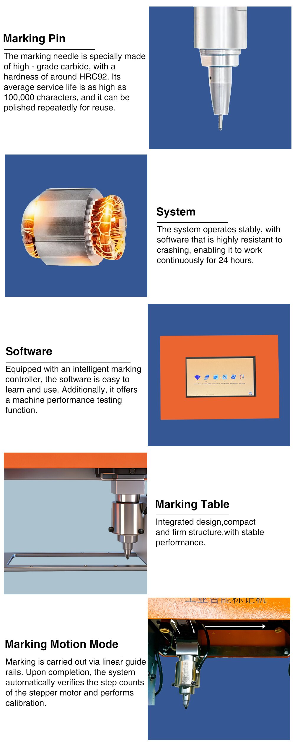 4. The marking needle is made of high-hardness alloy with a hardness of about HRC92. It has an average service life of up to 100,000 characters and can be repeatedly polished and reused.